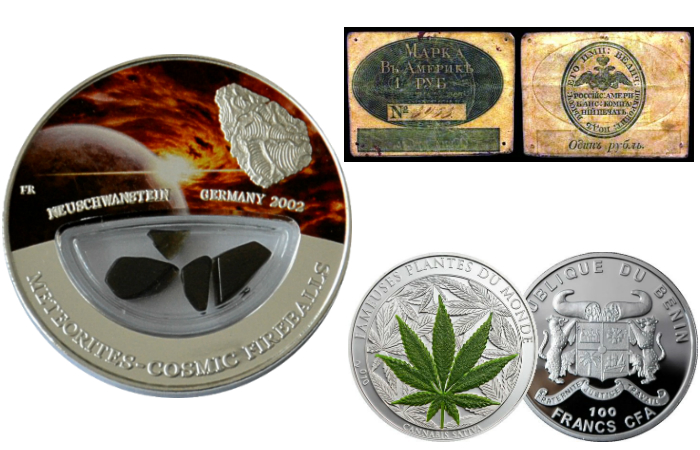 Первая в мире серебряная монета с изображением марихуаны была выпущена правительством западноафриканской Республики Бенин. На обратной стороне монеты есть ярко-зеленый лист конопли. Если его потереть, то лист издает явный аромат марихуаны, который вырабатывается синтетическими добавками