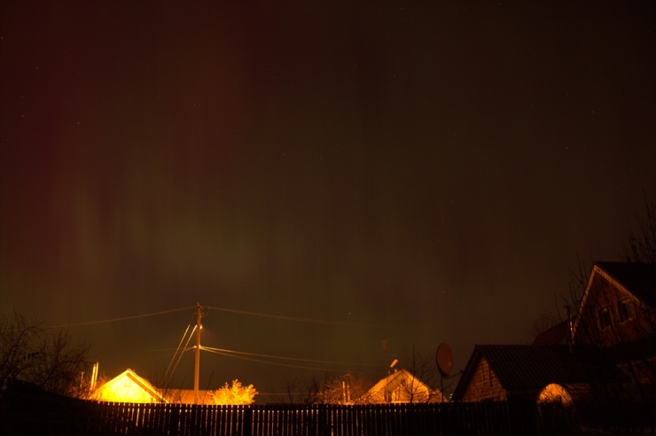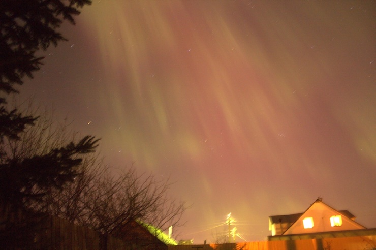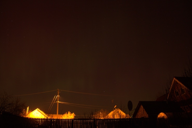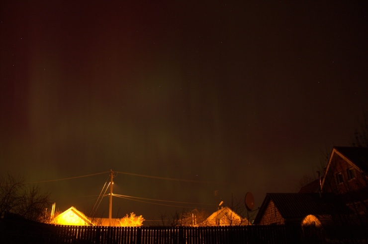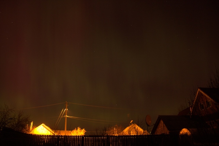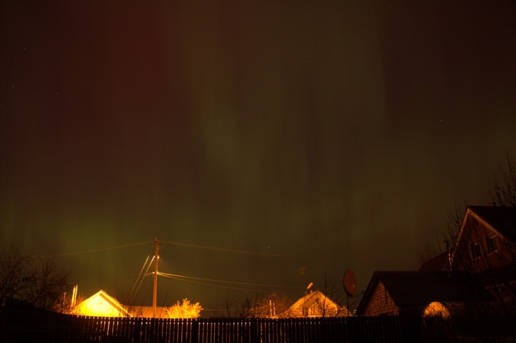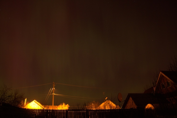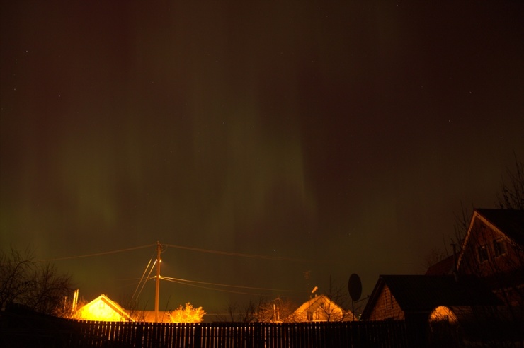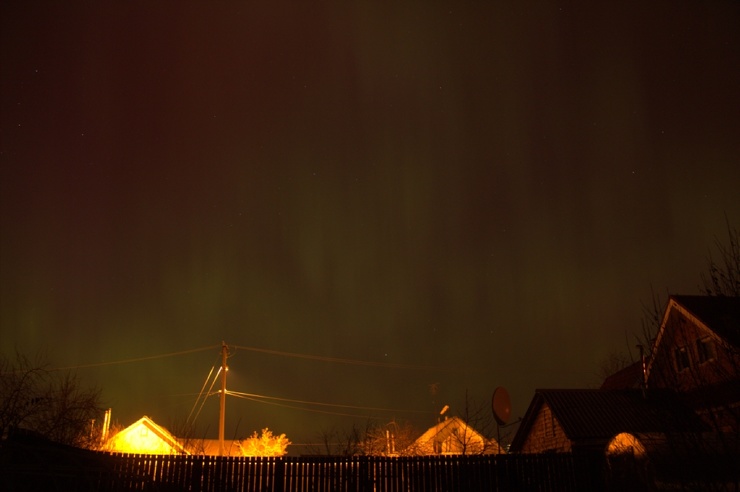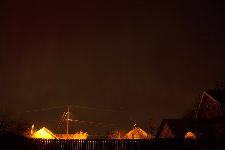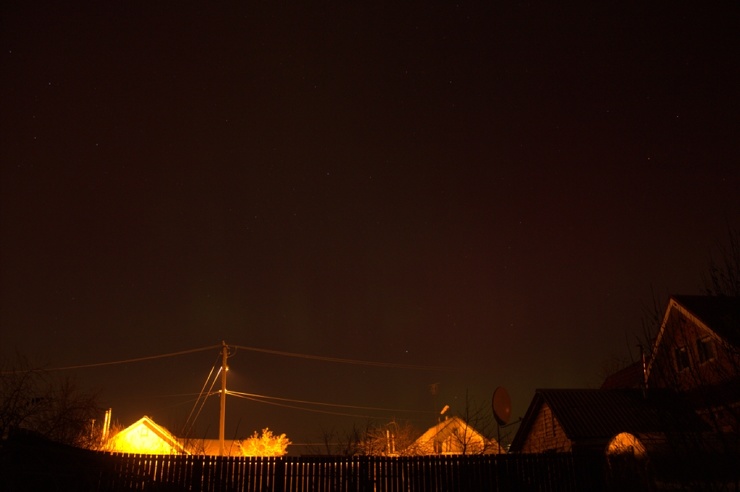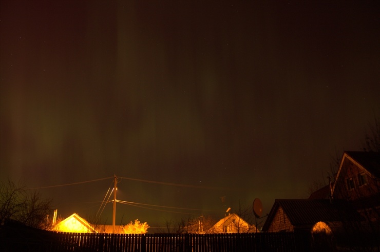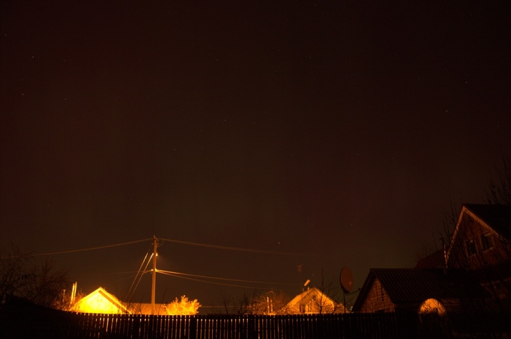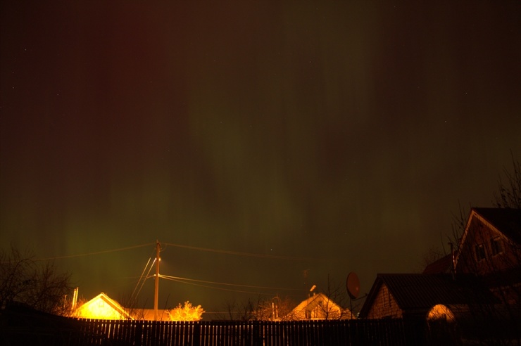 Фотографии северного сияния в г. Березовском. Автор фото - Роман Олегович (мой папа). Сначала он вышел на улицу, а потом говорит, там два столба на небе, скоро северное сияние начнется. Я не поверила, посмотрела на эти столбы вначале, меня не впечатлило. Через некоторое время он снова позвал меня. Я вышла, и тут-то началась красота: в зените такое серебристое облако, похожее на птицу или ангела, расплывающееся в стороны. И все это прямо над тобой. А на севере всполохи были не только серебристые, а разных цветов: зеленые, фиолетовые и пурпурные. Это одно из самых чудесных зрелищ, определенно.