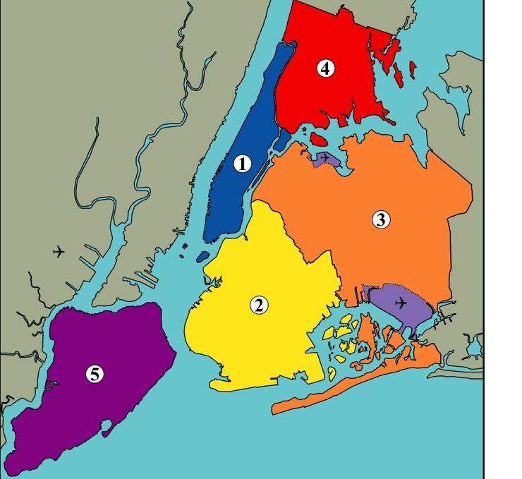 1. Манхэттен, 2. Бруклин, 3. Куинс, 4. Бронкс, 5. Статен-Айленд.