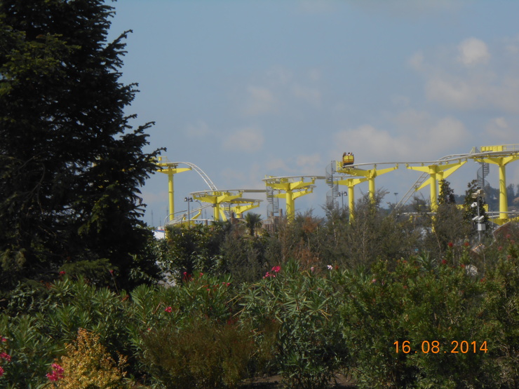 На входе в Сочи-парк мы предъявили наши билеты с канатки, и получили скидку на вход в парк ( в прошлом году мы заплатили где-то 900 со взрослого и 700 за ребенка с учетом скидки). в этом году билеты подорожали - взрослые по 1600, детские - 1400 (типа того). Билеты действуют весь день, можно кататься на чем хочешь и сколько хочешь, плюс всякие развлекательные мероприятия (у нас было вечернее цирковое представление, на которое мы не пошли - уморились). Пройдя через турникет, нам поставили печати в билеты и надели браслеты (можно выйти, потом вернуться) и велели развлекаться.