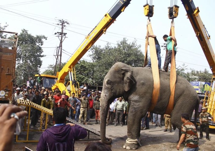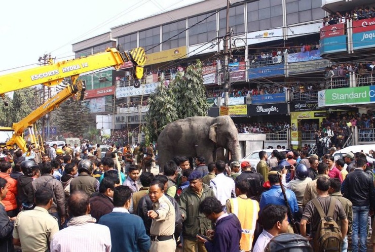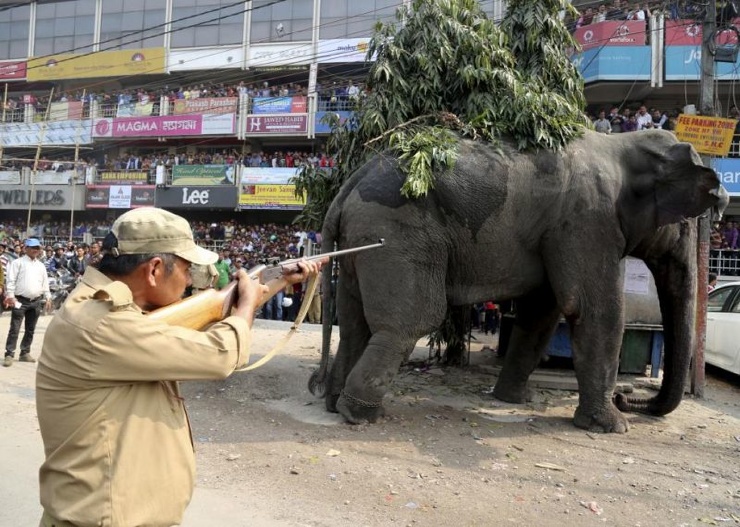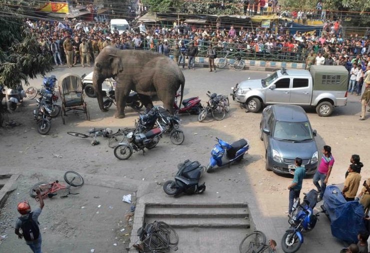 В индийском городе Силигури слон, забредший в жилой квартал из джунглей, испугался шума и устроил дебош. Животное начало крушить машины, мотоциклы и даже дома. Успокоить его удалось с помощью трех выстрелов транквилизатором.
