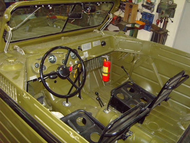 Дизайн кабины экипажа, если здесь уместно использовать столь громкое определение, был по-спартански прост, поскольку плавающий автомобиль изначально проектировался по заданию военных. Какой-то особый уровень комфорта ни для экипажа, ни для пассажиров предусмотрен просто не был. А по общему оформлению плавающий автомобиль ГАЗ-46, скорее, был похож на катер. Приборный щиток МАВ был полностью позаимствован с внедорожника ГАЗ-69. При этом на щитке приборов имелись тахометр и сигнальная лампочка, которая оповещала о появлении воды в трюме. Рычаги управления трансмиссией находились с правой стороны от водителя. Кронштейны педалей отличались своей необычной формой и находились близко друг к другу, для того чтобы было как можно меньше разных технологических отверстий, через которые вода могла попасть внутрь корпуса автомобиля. Рама ветрового стекла могла быть уложена на капот, а над пассажирским отсеком можно было легко растянуть тент из брезента. Передний ряд сидений включал в себя два кресла: для командира и водителя. Позади них была смонтирована трехместная скамья, не имевшая регулировок. Для удобства обслуживания в кабине автомобиля был установлен топливный фильтр.