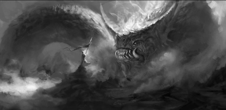 Он был так велик, что лишь обвив землю кольцами, мог найти себе место. Его дыхание было таким ядовитым, что стоило ему рассердиться и выдохнуть со всей силы — любая живая тварь, оказавшаяся в округе, падала замертво и погибал урожай. Своим раздвоенным языком он сбрасывал холмы и целые деревни прямо в море, подхватывал и ломал не то что дома, но и корабли — а все для того, чтобы сожрать людей, прятавшихся внутри.