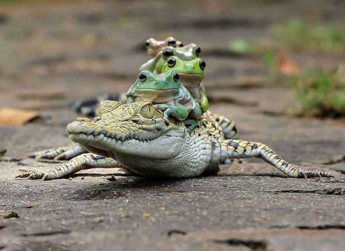 Фотограф Танто Йенсен (Tanto Yensen) близ города Тангеранг в Индонезии стал свидетелем необычного зрелища, когда пять бесстрашных лягушек оседлали каймана...