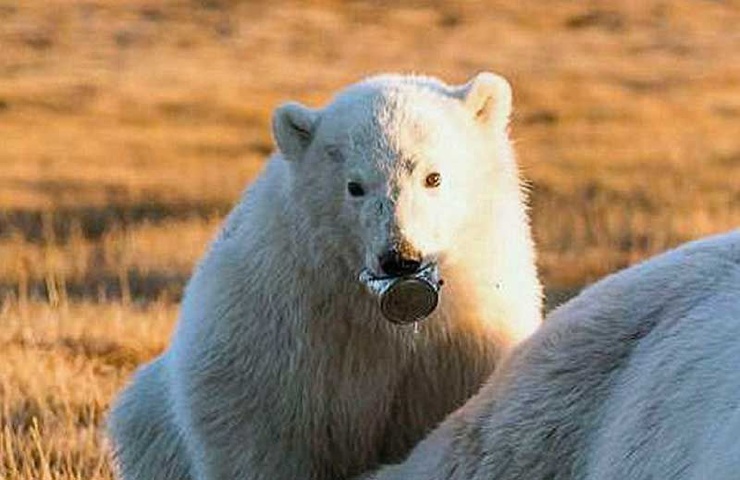 Белый медвежонок две недели промучился с застрявшей в пасти консервной банкой