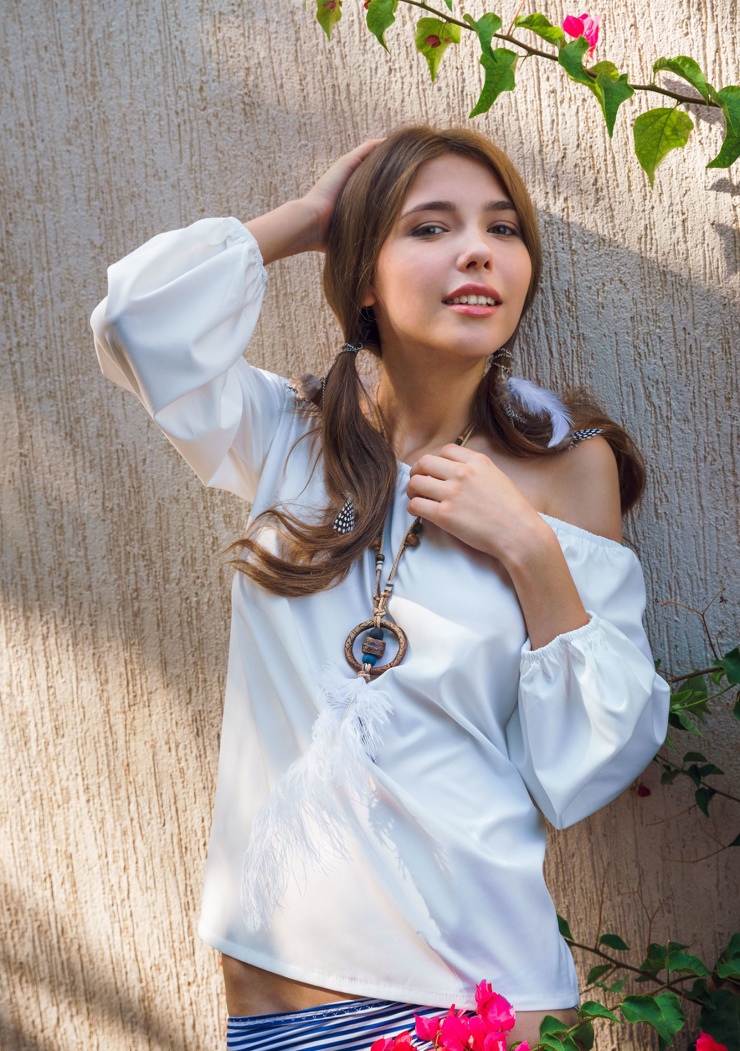 Кареглазая шатенка с причёской хвостиками, в белой кофточке и полосатых трусиках, представляет себя стоя на фоне белой стены и лёжа на каменной лестнице в окружении цветов
