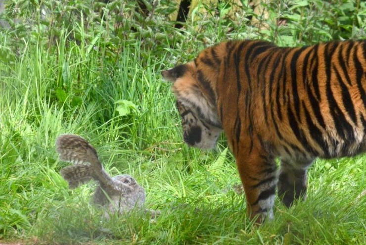 В зоопарке Пейтона города Девона, Великобритания, маленький совенок, еще не умеющий летать, выпал из гнезда прямо в вольер к молодому тигру. Несмотря на свои скромные габариты птенец дал хищнику достойный отпор и не стал обедом.