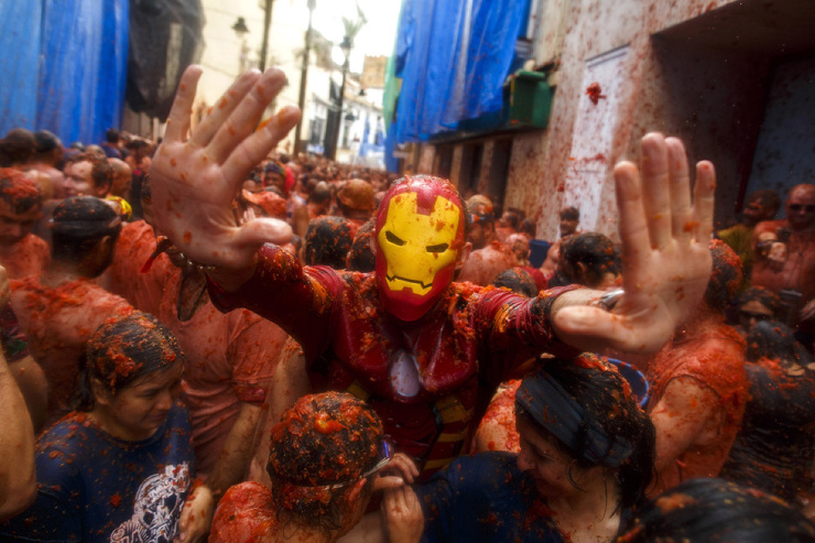 Сигналом к началу сражения служит выстрел из водяных пушек. Каждый сам за себя. По правилам, чтобы не травмировать друг друга, перед броском помидор должен быть раздавлен. Также нельзя приносить с собой предметы, способные нанести серьезные увечья, например, стеклянные бутылки. (Фото Pablo Blazquez Dominguez):