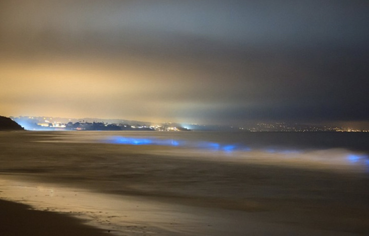 Неоновые синие волны можно наблюдать и у пляжей Калифорнии. В определенный период у берега скапливается фитопланктон. При движении волн, когда волна накатывает на берег, образуется свечение.