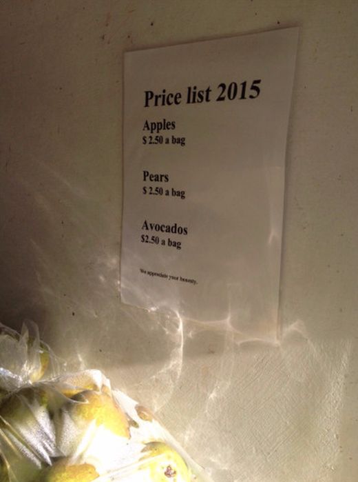 Эти фотографии были сделаны на одной из трасс Новой Зеландии. Здесь располагается необычный ларек, в котором продаются фрукты. Но здесь нет продавца – покупатели сами взвешивают товар и кладут за него деньги в специальную коробку. Торговля основана исключительно на доверии. Подумайте, возможно ли это в нашей стране?