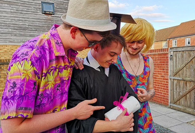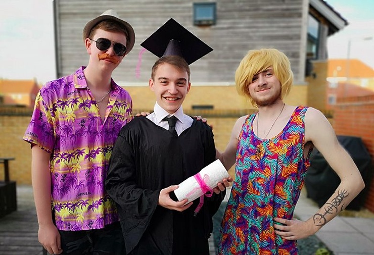 Товарищи вместе с Крисом сгоношили костюмы выпускника, бати и маман, а потом в таком виде устроили фотосессию. Родителям снимки понравились - они заметили, что это отличная идея.