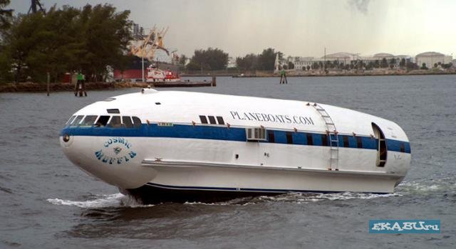 Этот Боинг 307 ещё в 30-ых летал в TWA Говарда Хьюза, но к 70-ым, поменяв много владельцев, уже выработал свой ресурс, и для энтузиастов его восстановление оказалось слишком дорогим. Поэтому ему отрезали ноги/руки хвост и крылья, и превратили в уникальный прогулочный катер, который теперь ходит в прибрежных водах Майами и Форт-Лаудердэйла.