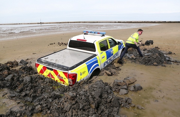 В неприятную ситуацию попал полицейский на пляже Мерсисайд в Великобритании. Офицеры из полиции порта Ливерпуля выехал на пляж в поисках пропавшей женщины. Колеса его патрульного автомобиля застряли в вязком иле. Страж порядка попытался откопать застрявший пикап, но приближающийся прилив помешал ему это сделать. Полицейскому осталось только наблюдать, как тонет его патрульная машина, и надеяться, что после отлива, ее получиться вытащить.