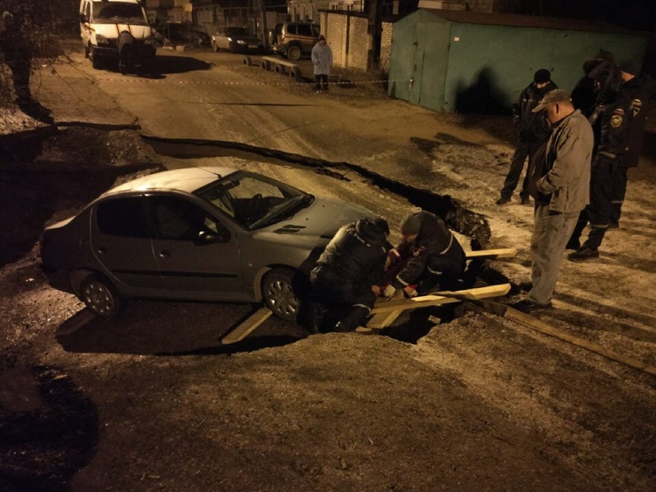 Напомним, что 28 ноября 2016 года на улице Интернациональная под землю провалилась «Лада Калина». Огромный провал объемом более шести метров с водой почти утянул в себя машину. В тот раз все закончилось печально: автомобиль так и не смогли извлечь из ямы, даже после откачки воды. Как только стало ясно, что бесполезно продолжать попытки, яму просто засыпали землей, к большому огорчению хозяев авто.