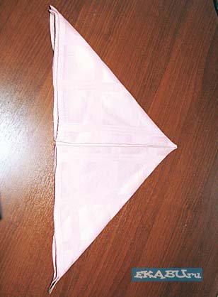 Итак, берем одну тряпочную салфетку и складываем вот так. Сначала пополам, а потом два угла от сгиба внутрь. Смотрим на картинку: