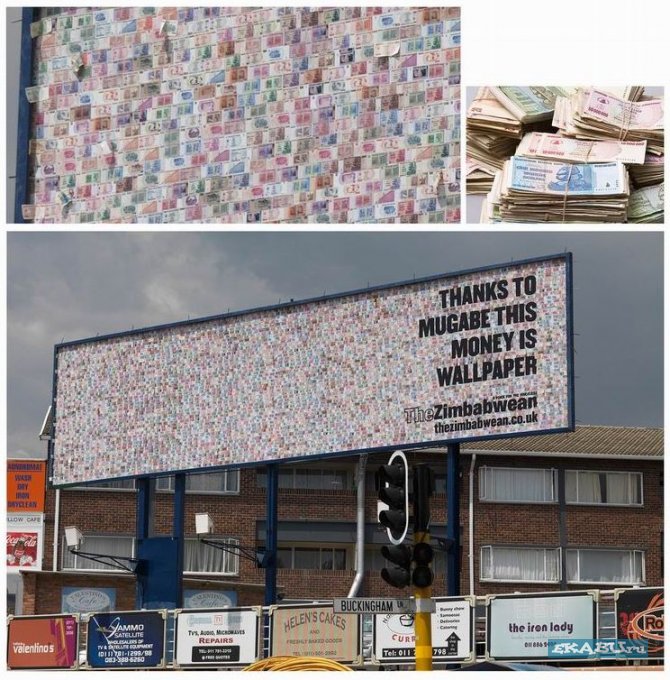 страна в которой выпущена 100 000 000 купюра, может позволить себе делать плакаты из денег, там такая инфляция сейчас какой никогда и ни у кого не было ! Да и если собрать все деньги с этого плаката хватит максимум на пару пачек сигарет!