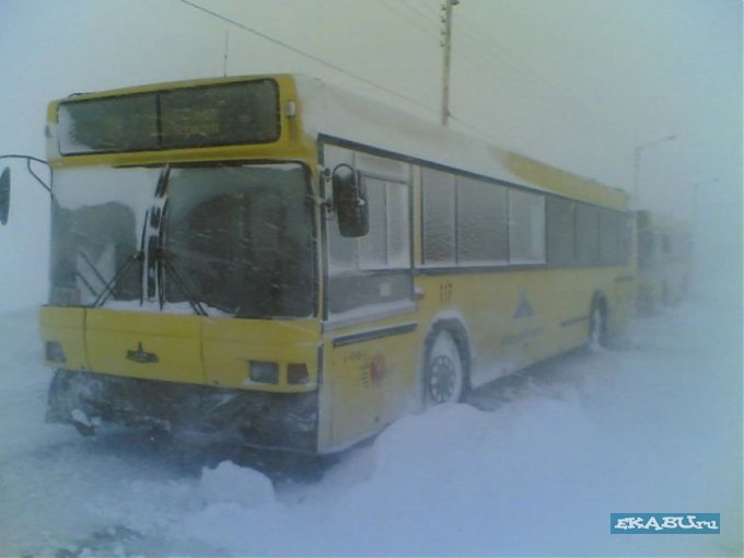 Это события зимы 2008.Тогда сильные пурги были, видимости не было, поэтому пришлось бросать автобусы на трассе Норильск-Кайеркан. Ветром выбило стекла и все замело. Короче 19 (вроде бы) авттобусов в расход! Людей там уже не было. На вездеходах мы не гоняем, эт только если в тундру где нет дорог или сильно замело! Воть!!!