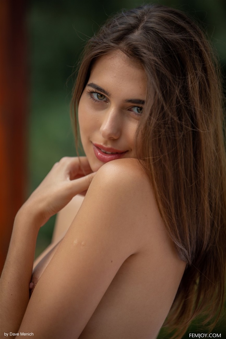 Зеленоглазая и длинноволосая шатенка из Кипра в полностьюобнажённом виде представляет себя стоя, сидя и лёжа на деревянной кровати с пологом и застеленной белым покрывалом