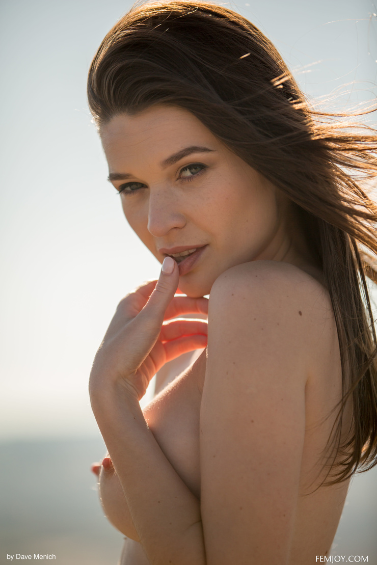 Зеленоглазая и длинноволосая шатенка в полностью обнажённом виде представляет себя стоя и сидя на вершине скалы