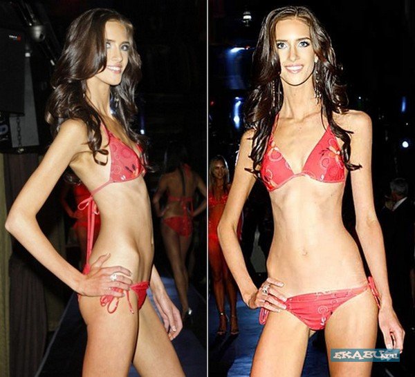 Вам нравится эта девушка? Австралийцам, похоже, она по душе. Ее зовут Стефани Намоска, ее рост 180 см, вес - 49 кг. Стефани стала одной из 32 финалисток конкурса "Мисс Австралия", которых выбирали из 7000 жительниц Австралии. Девушка заняла второе место. Но на следующий день после конкурса местные газеты вышли с заголовками типа: "Костлявая или красивая?" и с этими фотографиями.