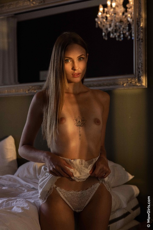 Красиво попозировав перед нами в легкой кружевной сорочке, плоскогрудая женщина удобно размещается на огромной кровати и медленно раздевается до гола. Оголив перед камерой свои миниатюрные прелести, горячая дамочка тут же раскрывает свою рогатку и игриво теребит пальчиками бритую розовую пиздёнку.