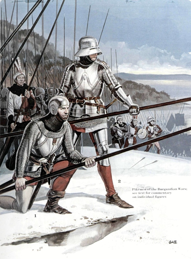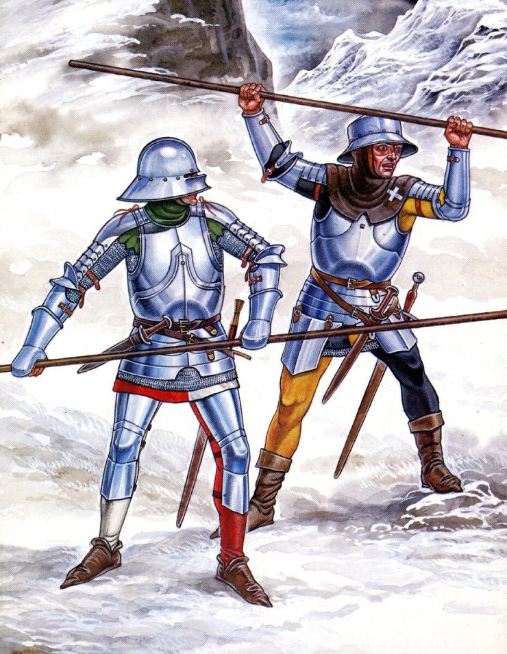 Настало время поговорить о парнях, которые первыми начали насаживать вооруженных до зубов рыцарей на пики и рубить их алебардами. Именно они трижды разбили лучшую кавалерию Европы — бургундских ордонансных рыцарей, а в конце концов убили их герцога Карла Смелого.