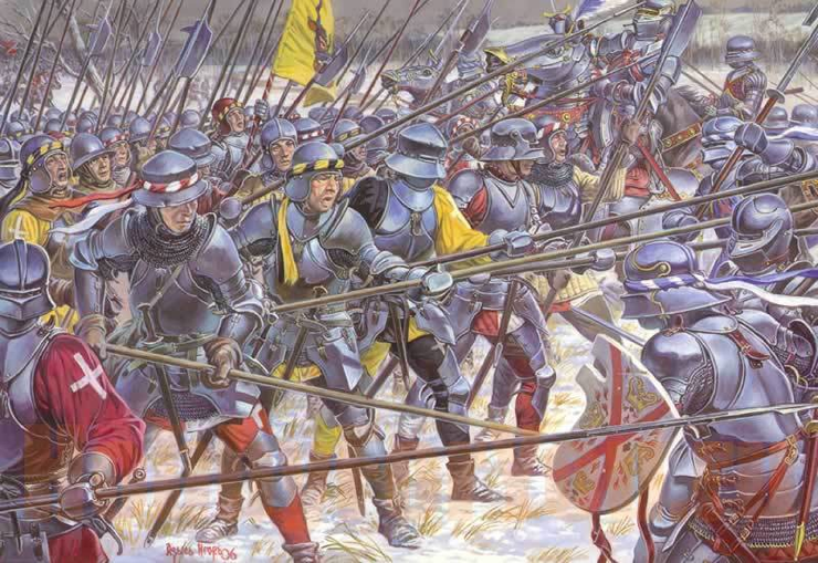 И вот на поле боя под звуки волынок и барабанов выходила огромная баталия. Первые ряды с длинными, почти шестиметровыми пиками и в отличных доспехах могли остановить любую конную атаку, а если противник все-таки вклинивался глубже, его рубили, кололи и стаскивали крюками с коня алебардщики. Арбалетчики использовались в качестве застрельщиков.