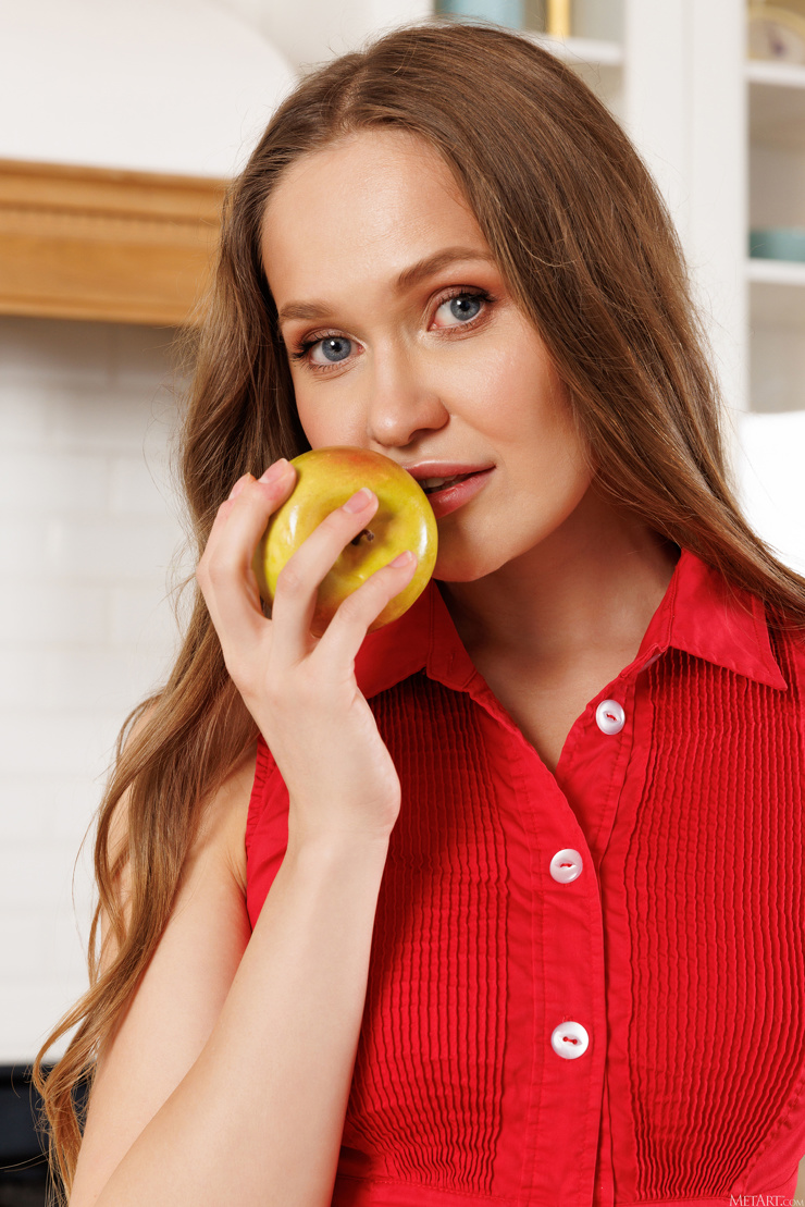 Соблазнительно медленно сняв перед нами красное платье с трусиками, голая девушка с пухлыми нежными сосочками на плоских титьках эротично извивается в разных позахкухне и, замирая перед камерой с широко раздвинутыми ногами, выставляет на показ свою бритую розовую пизду.
