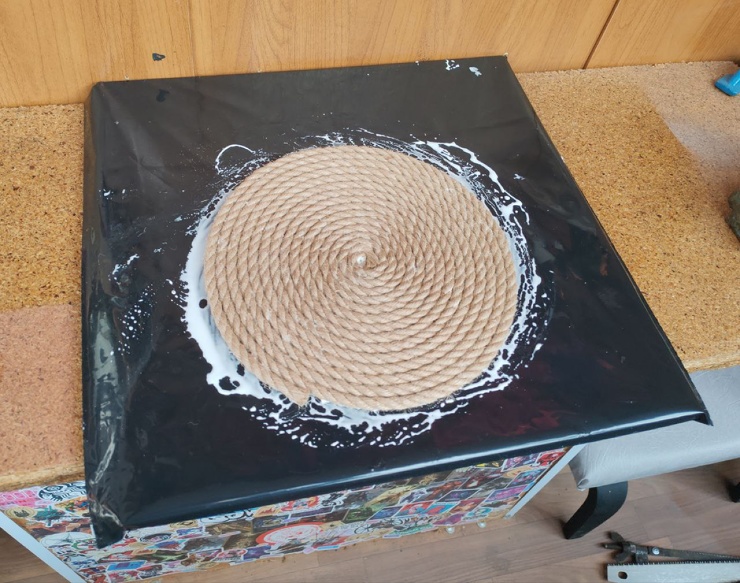 Первую подставку делал так. Обильно полил ПВА черный пакет на базе и начал закручивать канат из центра по часовой стрелке. Не накидывал петли, а именно крутил всю поделку, захватывая кольцами побольше клея.