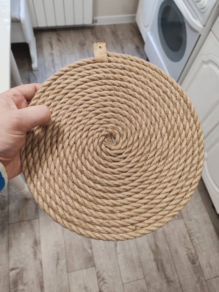 Накрутив «улитку» диаметром 24 см, перевернул ее и отложил в сторону сохнуть, предварительно пропустив через предпоследнее колечко кусок бретельки — она нужна для фиксации кончика каната. Когда все подсохло, пробил в бретельке люверс, чтобы подставку можно было подвесить на гвоздик.