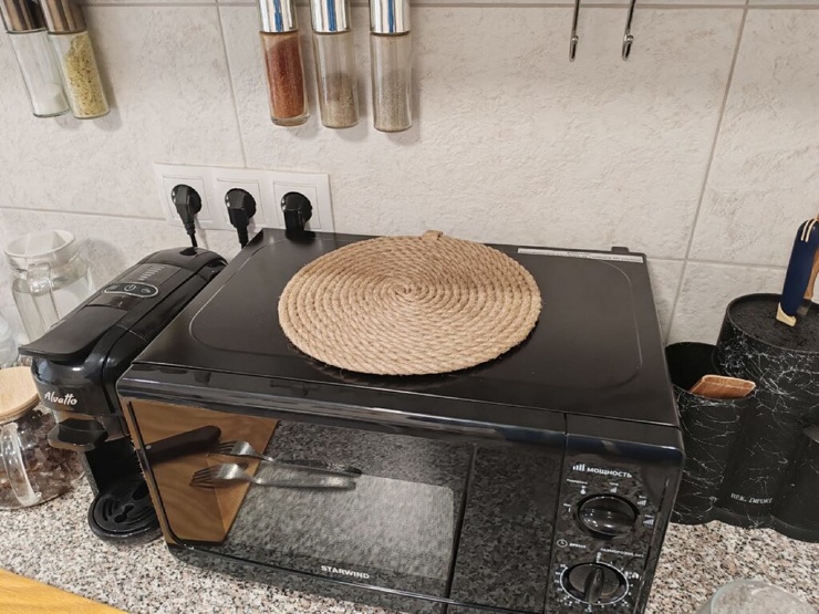 В результате подставка получилась отстойной, но для сельской местности пойдет. Нюанс в том, что высохший ПВА выглядит на обратной стороне очень неопрятно, эдакой слюдяной корочкой. Плюс, поделка не проклеилась полностью, и внешние кольца пришлось доклеивать еще раз. Кинул эту подставку под заварочный чайник на микроволновке, там выглядит вроде нормально.
