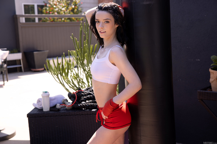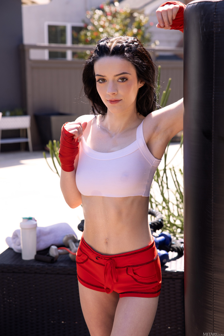 Закончив свою тренировку с боксерской грушей, уставшая потная спортсменка решила передохнуть и тут же разделась до гола, дав остынуть своему разгоряченному телу.