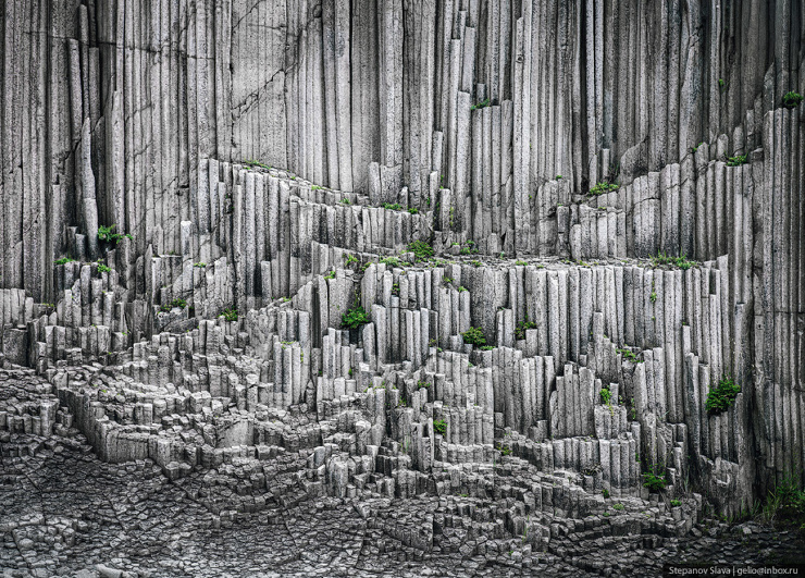 7. Основное официальное объяснение появления столбчатой структуры — особые свойства расплавленного базальта, который при охлаждении застывает в виде вытянутых столбов с образованием трещин правильной формы.