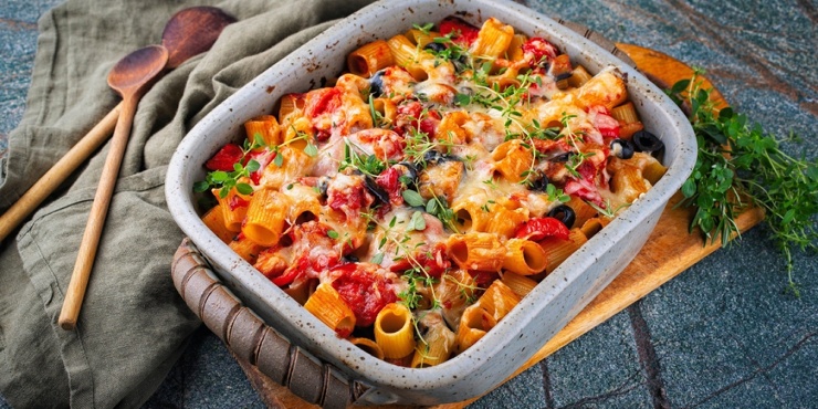 Простая запеканка из макарон с баклажанами и помидорами