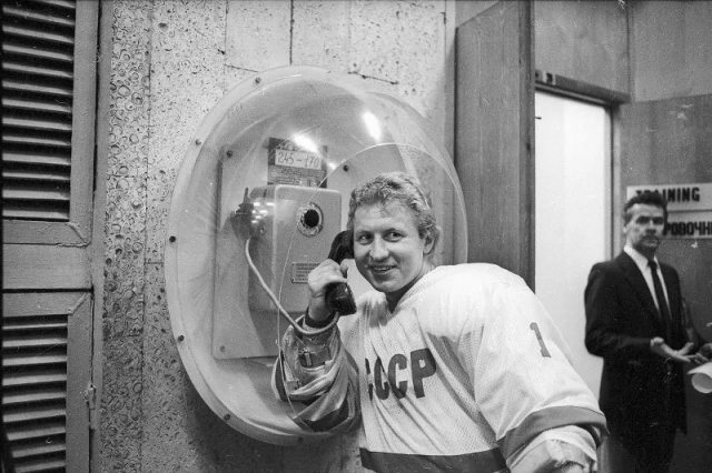 Вратарь сборной СССР Владимир Мышкин у телефона. Звонок домой с победой, 1977–1980.