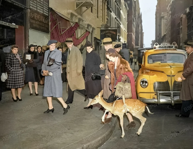 2. Удивленные зрители с изумлением наблюдают, как мисс Бет Питт выгуливает своего любимого оленёнка по кличке Стар Мессэдж в центре Нью-Йорка 16 ноября 1942 года.