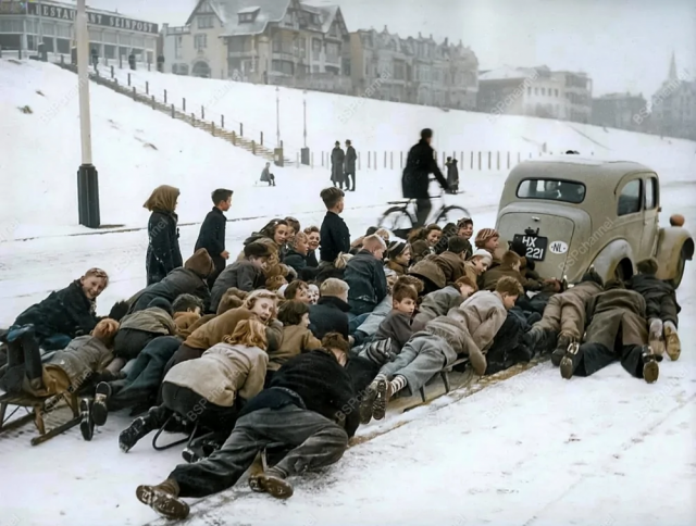 17. Автомобиль катает детей на санях на заснеженной дороге в Схевенингене, Нидерланды. 1940-е.