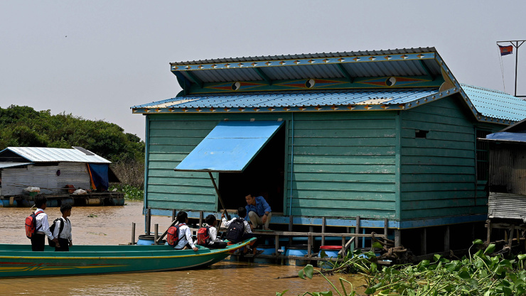 Жители Камбоджи, около 3 миллионов человек, живут на воде рек Меконг и Тонлесап, где строят дома и школы на сваях