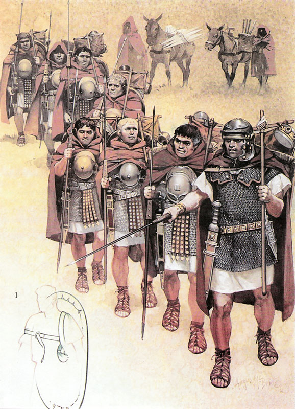 Доспехом почти повсеместно стала лорика хамата — кольчуга с наплечниками на крючках. Естественно, под ней был поддоспешник. Голову прикрывал шлем типа монтефортино, чаще всего бронзовый. Он имел нащечники, иногда небольшой назатыльник, а наверху — шишку, куда вставлялись перья или конский волос. Ноги закрывали поножи.