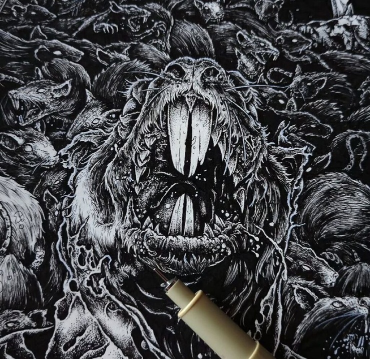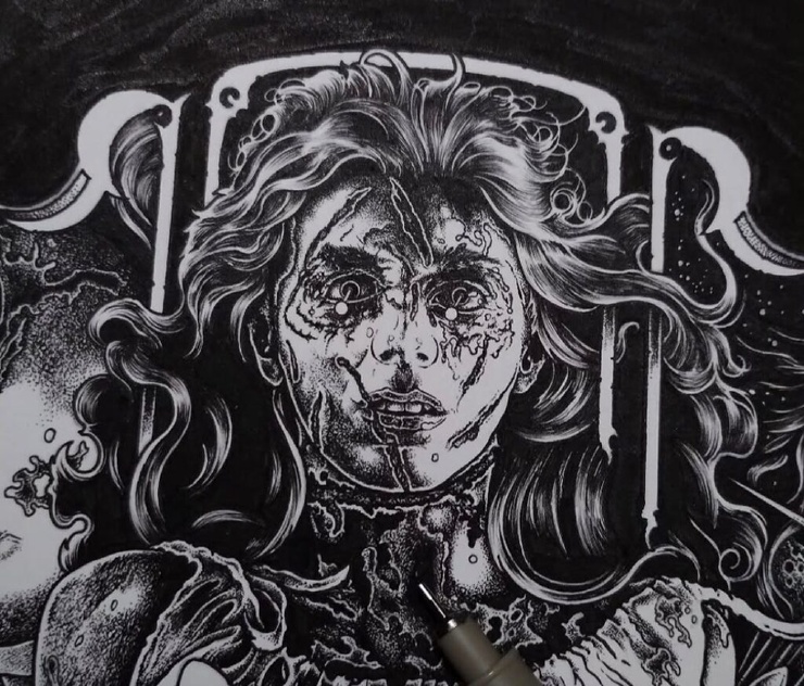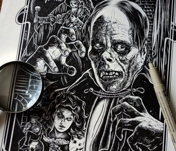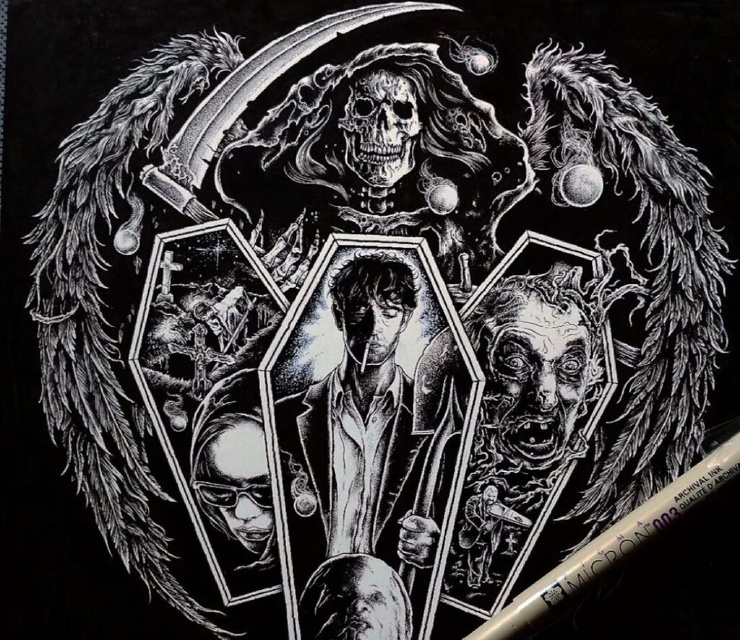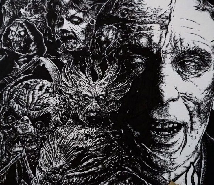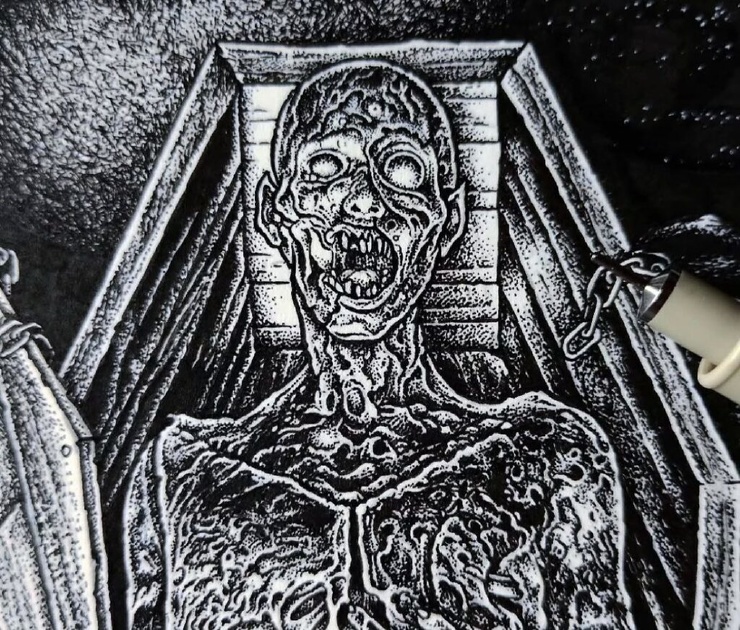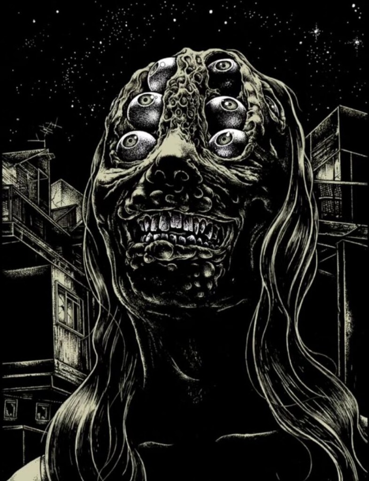 Александрос Пиромаллис — известный художник и сооснователь дизайн-студии Viral Graphics (например, она известна постерами и обложками для групп Soundgarden, Melvins и Swans). Он рисует иллюстрации по старым хоррорам и не только, соединяя тьму и мифы в разных вариациях. А еще делает принты для футболок и скейтбордов