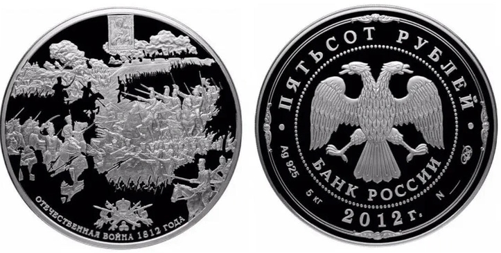26 ноября 2012 года Центральный банк России выпустил серебряную памятную монету номиналом 500 рублей, посвященную 200-летию победы России в Отечественной войне 1812 года. Монета представляет собой целых 5 (!) килограммов чистого серебра, она была выпущена эксклюзивным тиражом в 50 экземпляров.
