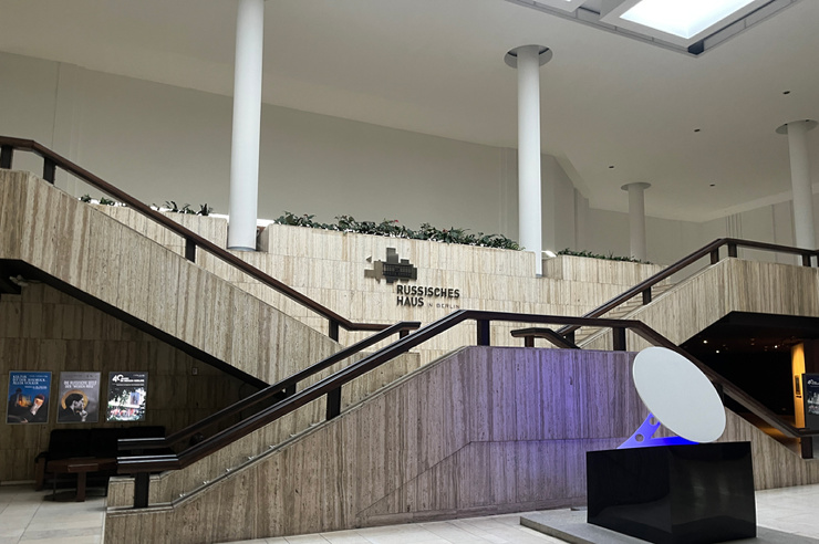 Внутри кинотеатр, конференц- и концертный залы, огромная библиотека, буфет, выставочные пространства, Центр русского языка, «Русский колледж» и отделение «Почты России». Начиная с 1990-х часть помещений сдавалась в аренду совсем уж сторонним организациям вплоть до кабаре и бутиков. До апреля 2022-го внутри отлично помещалась и радиостанция «Русский Берлин», открытая эмигрантами из 1990-х, вовремя пробившими себе частоту, где почти круглосуточно ставили в эфире музыку в диапазоне от Лепса до Лободы. С началом «известных событий», впрочем, радио оперативно переименовалось в «Голос Берлина» и попыталось запустить информационное вещание, чтобы заблаговременно дистанцироваться от RT, передачи которых после запрета Russia Today в Германии крутили в кинотеатре этажом ниже. Но кончилось тем, что радио выселили из «Русского дома» практически одним днем.