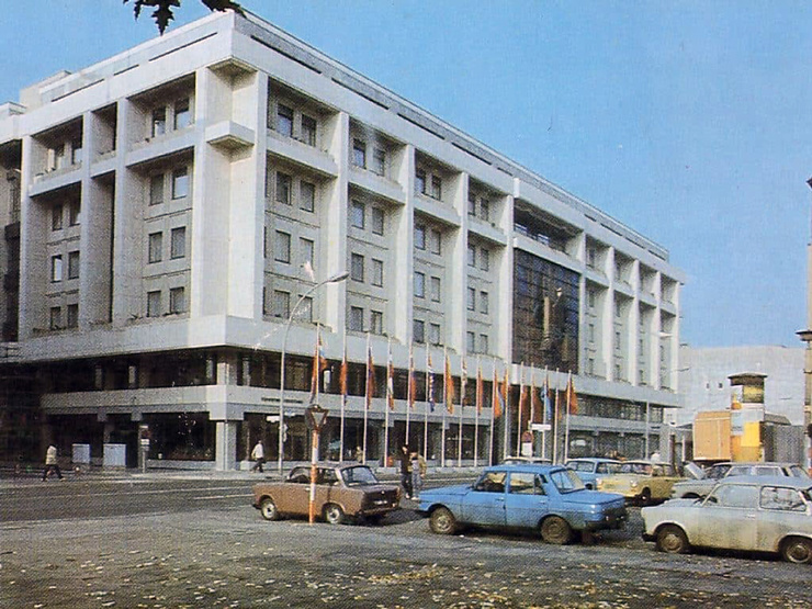 Строительство по проекту известного восточногерманского архитектора Карла-Эрнста Свора шло три года. Стилем выбрали то, что политкорректно называется «советский модернизм», а в народе — «брежневское барокко». Получилось действительно и мрачновато, и помпезно: болгарский известняк, гранит из области лужицких сербов (близ границы с Чехией и Польшей), витражи из магдебургского стекла, семь этажей общей площадью 29 тыс. кв. м. Одно только центральное фойе — 1700 «квадратов»! Изначально в нем стоял «комнатный» памятник Ленину, но после объединения Германии на волне народного энтузиазма Ильич благополучно растворился в неизвестном направлении.