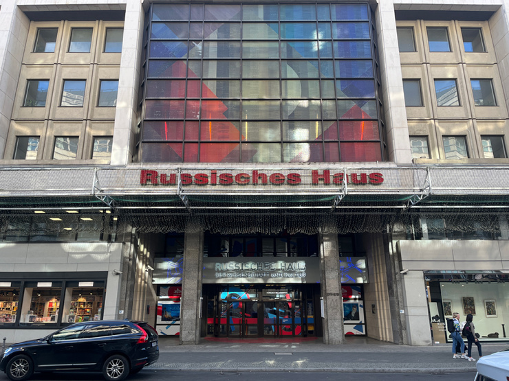 «Русский дом» в Берлине открылся в 1984 году, еще в столице ГДР, и по сей день остается крупнейшим из 96 филиалов сети. Его построили в районе Митте на Фридрихштрассе, одном из двух (наряду с пересекающим эту улицу в 5 минутах ходьбы бульваром Унтер-ден-Линден) кандидатов на статус берлинской Тверской. Постройку возвели на месте здания универмага, разбомбленного во Вторую мировую. Похожими коробками в ГДР вообще старались застроить весь тот район.
