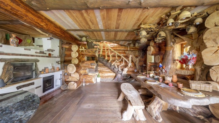 Также будущий хозяин получит в распоряжение полностью оборудованный для жизни дом с кабинетом и детским блоком. Вся мебель в доме сделала из дерева: шкафы, столы, стулья в виде грибов. В интерьере использованы пни, коряги, бревна, долбленая утварь. Там также можно увидеть декоративные металлические цепи, массивные кованые элементы и стилизованные светильники. При этом в доме все оснащено современными технологиями.