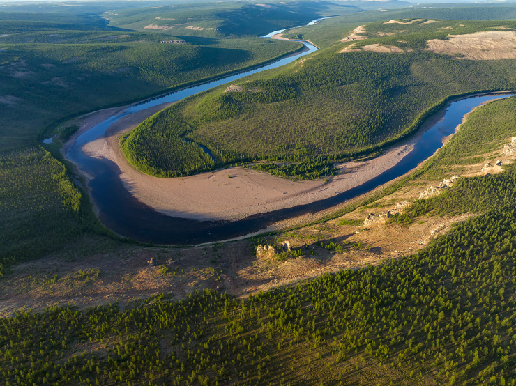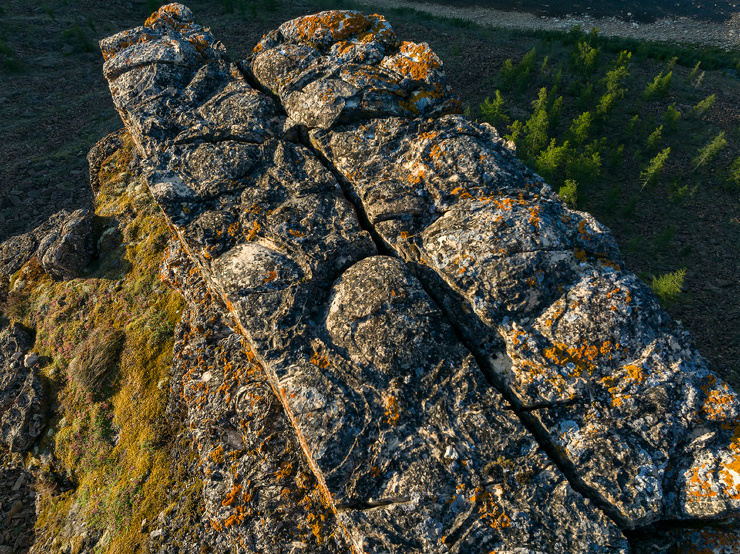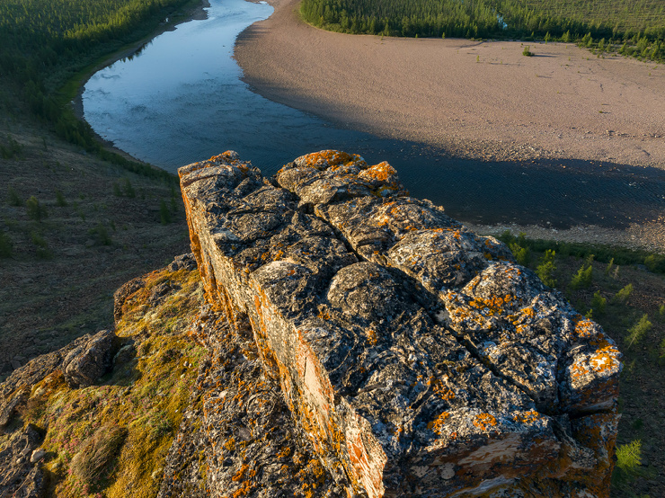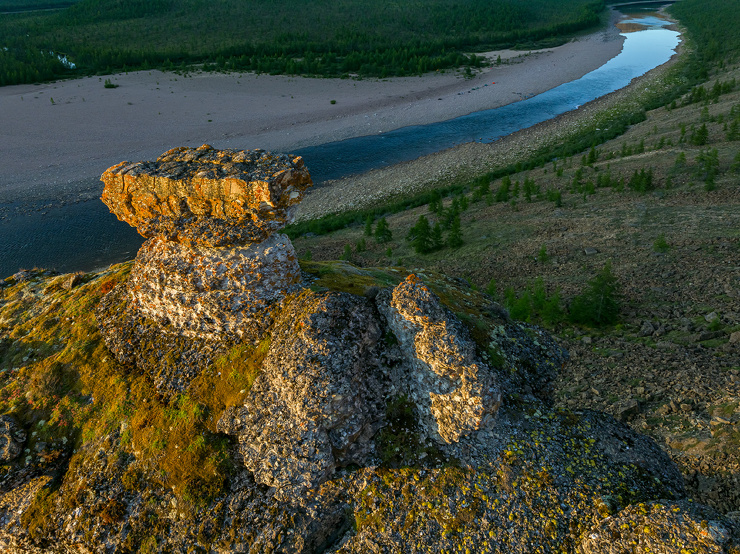 Как известно Котуйкан интересен не только своими ландшафтами и природой. Здесь ещё в камне прописана древняя история земли. А строматолиты одна из визитных карточек Анабарского плато. Где-то ещё в начале нашего сплава по Котуйкану на противоположном берегу я присмотрел группу останцов и слетал к ним на дроне. Обнаружил там один останец со шляпкой как раз из строматолитовой плиты. И естественно постарался обснимать его со всех сторон.