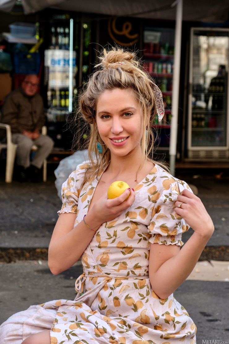 Her summer dress falls open as she presses against the garden wall, her naked body on full display while she arches with a teasing smile.