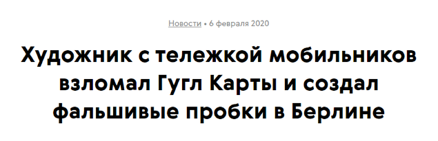 «Возможно ли создать фальшивые пробки, чтобы водители избегали вашей улицы?Саймону Векерту удалось обмануть Google Maps. Он выяснил, что Google Maps использует данные, отправляемые со смартфонов, чтобы определить, насколько быстро передвигаются люди и насколько загружены дороги. Поэтому Векерт решил немного развлечься. Он каким-то образом раздобыл 99 смартфонов, сложил их все в тележку и просто отправился прогуляться по центральным улицам Берлина.