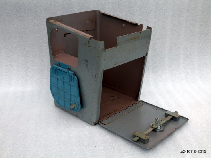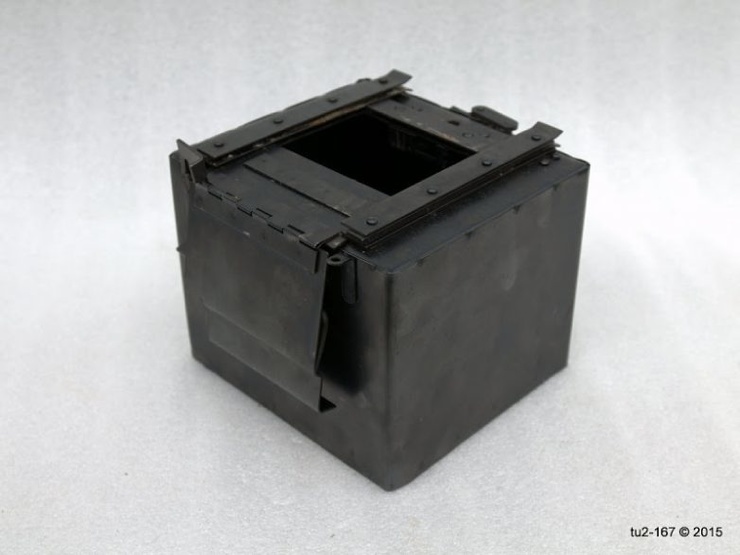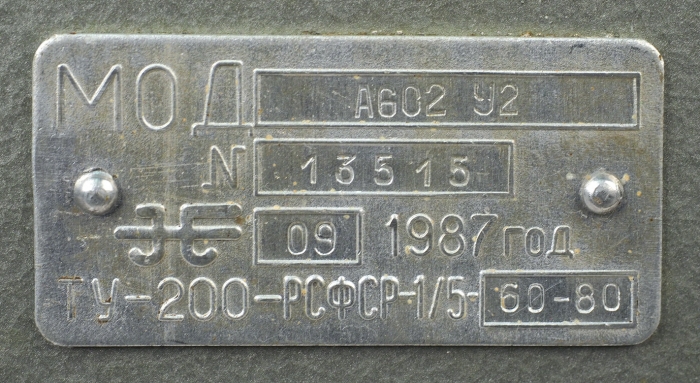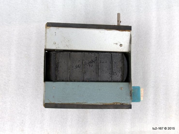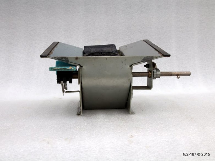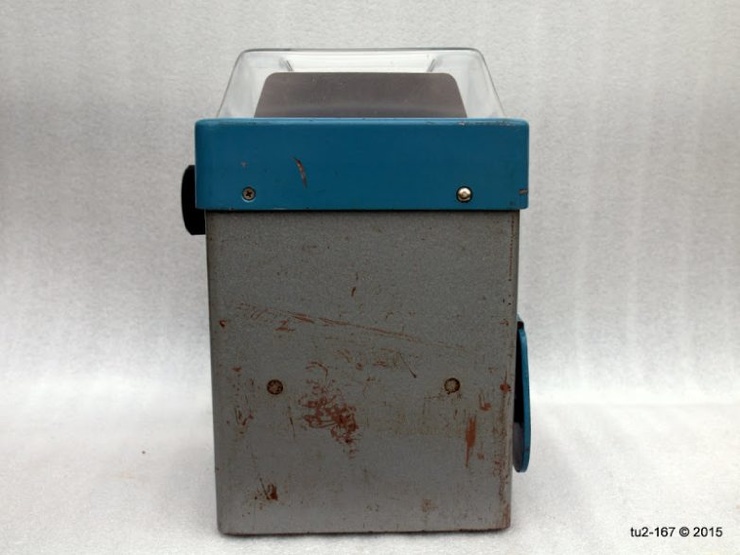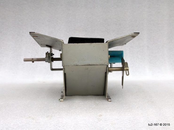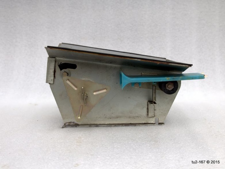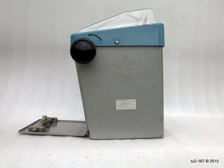 Это вид справа. Здесь расположена ручка привода и шильдик завода-изготовителя. Стрелка на поздних кассах наносилась краской. Я помню, что на ранних образцах она была выполнена также в виде шильды.