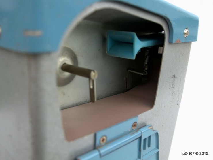 Вот так выглядит открытый люк. Катушка с билетами надевалась на шпиндель, а чтобы она не съезжала — фиксировалась пластиной. В свою очередь для уменьшения трения пластина была снабжена тремя выштамповками. Однако на внутренней стенке кассы выштамповок не было. Пластина на шпинделе фиксировалась овальной шайбой. Люк открывался достаточно примитивным ключом с двумя контактными точками. На этой кассе замок вообще проворачивается рукой.